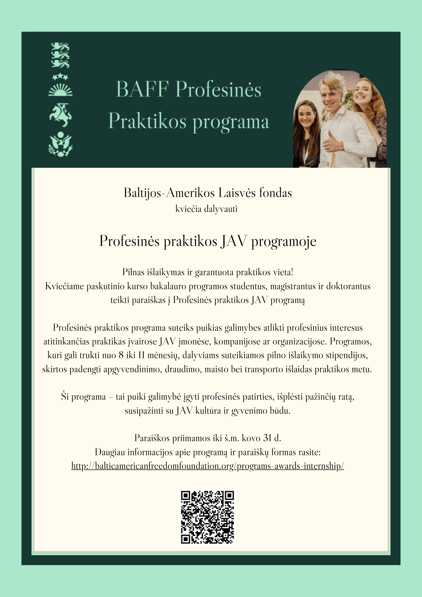 BAFF profesinės praktikos programa – tavo šansas įgyti tarptautinės patirties JAV! Ar svajoji apie išskirtinę profesinę patirtį, kuri gali pakeisti tavo karjerą? BAFF Profesinės praktikos programa suteikia galimybę 8–11 mėnesių praktikai JAV – pasaulinio lygio įmonėse, organizacijose, inovacijų centruose ir startuoliuose! Paraiškos priimamos iki kovo 31 d.!