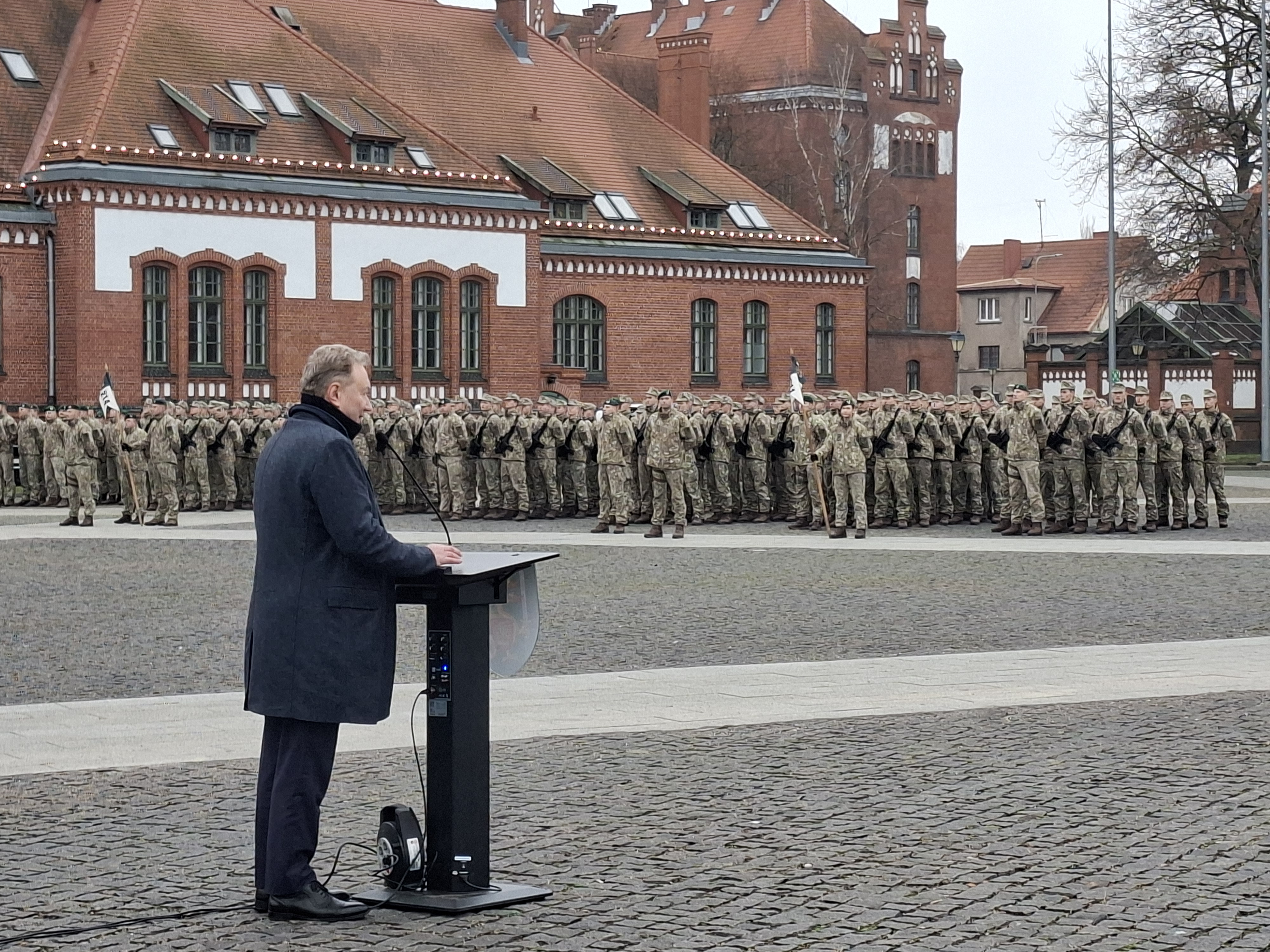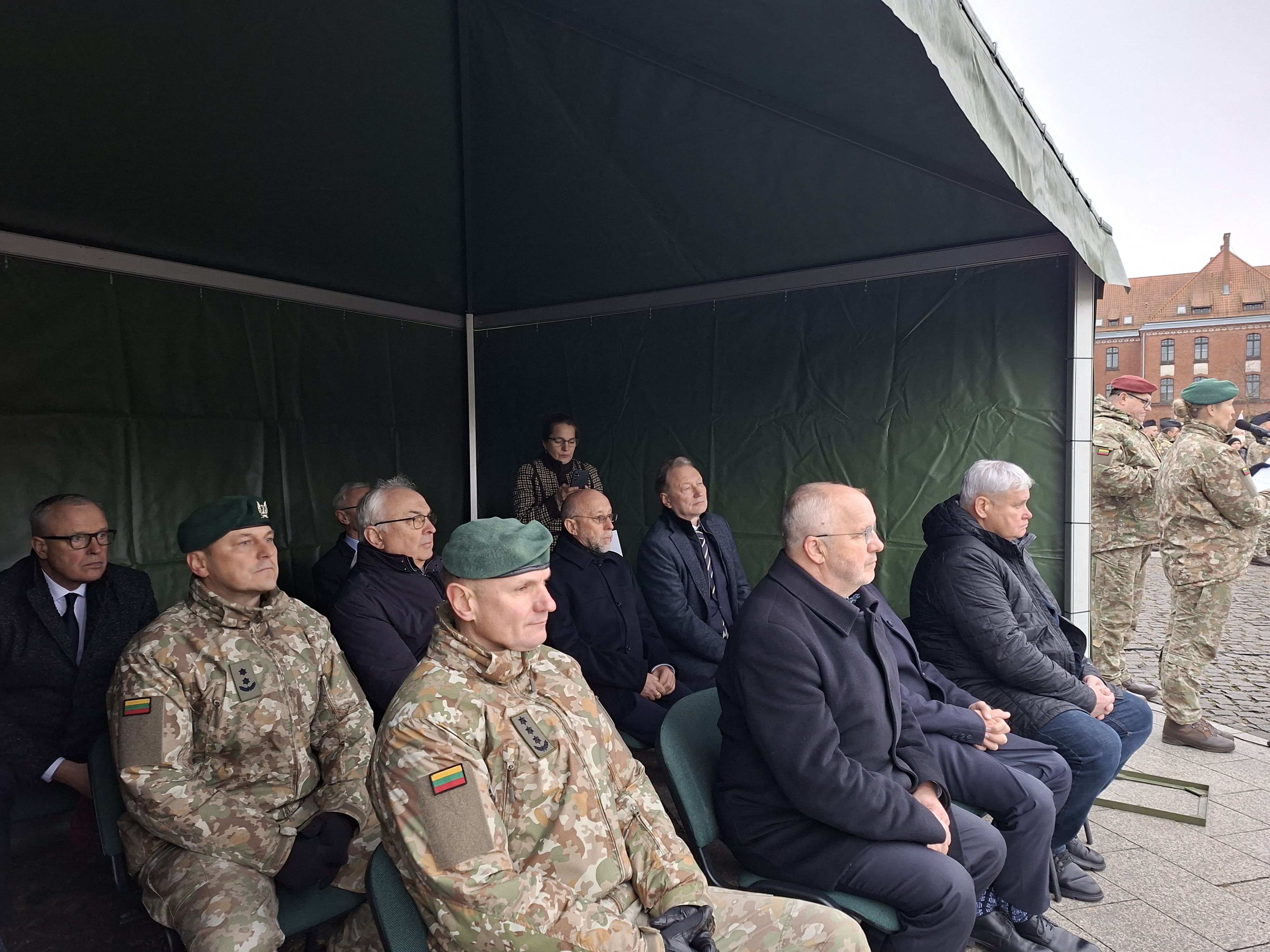 Po susitikimo LR Seimo pirmininkas ir KU rektorius dalyvavo pėstininkų brigados „Žemaitija“ nuolatinės privalomosios pradinės karo tarnybos karių iškilmingoje priesaikos ceremonijoje tradiciškai vykusioje Klaipėdos universiteto pagrindinėje aikštėje.