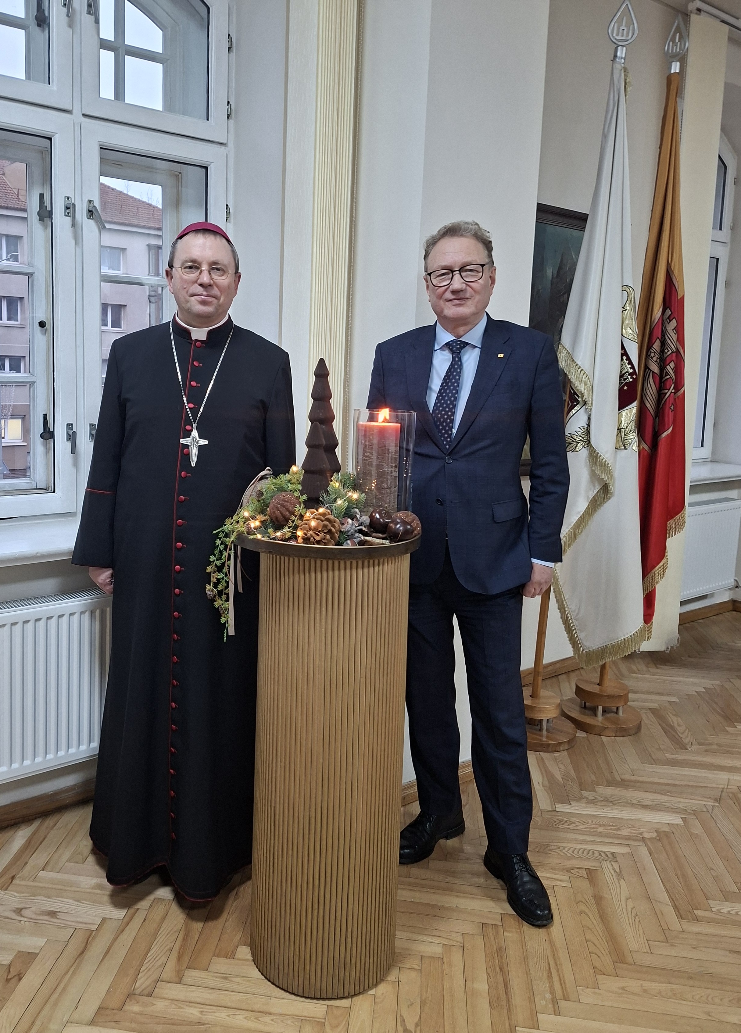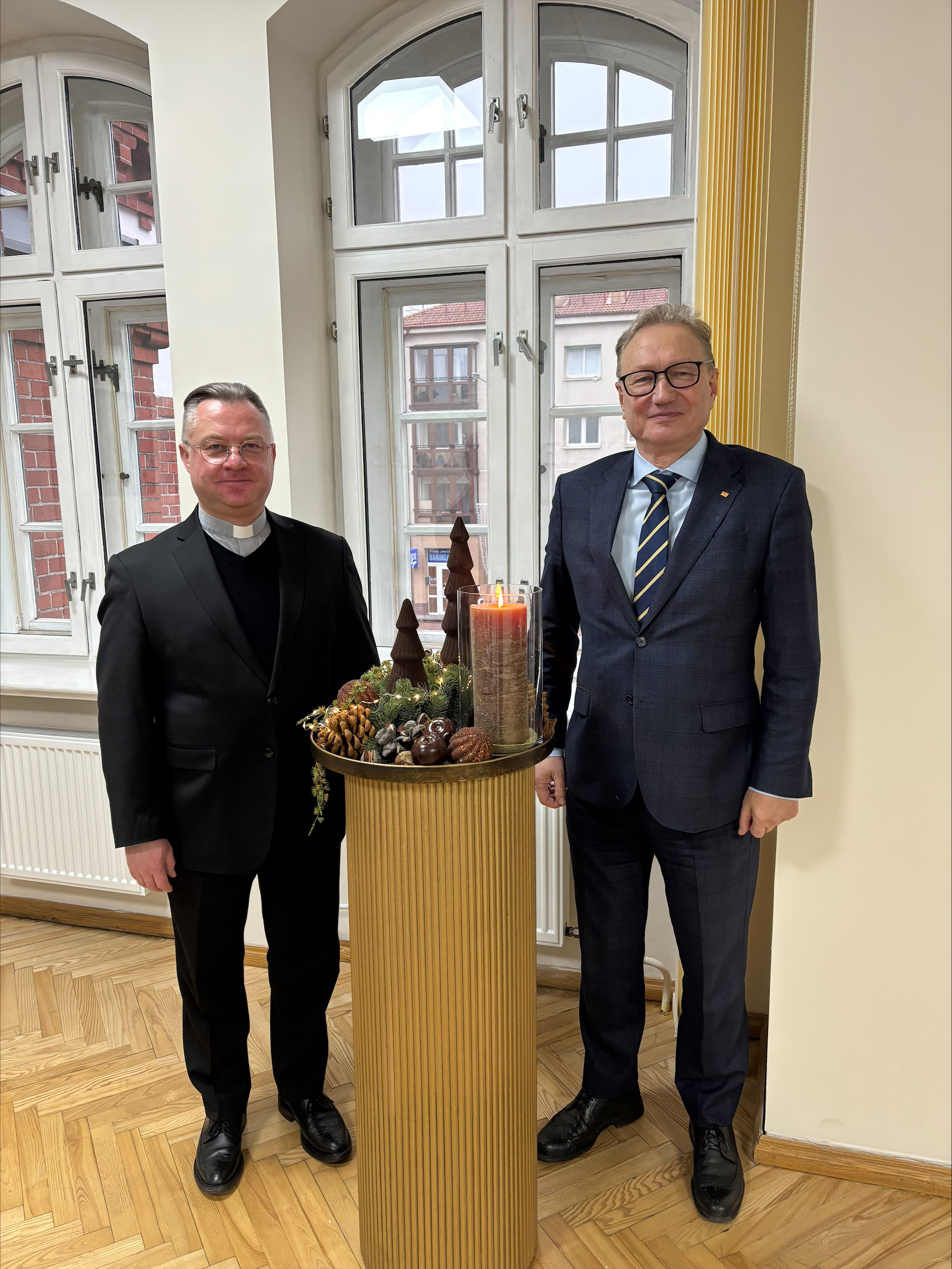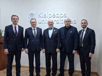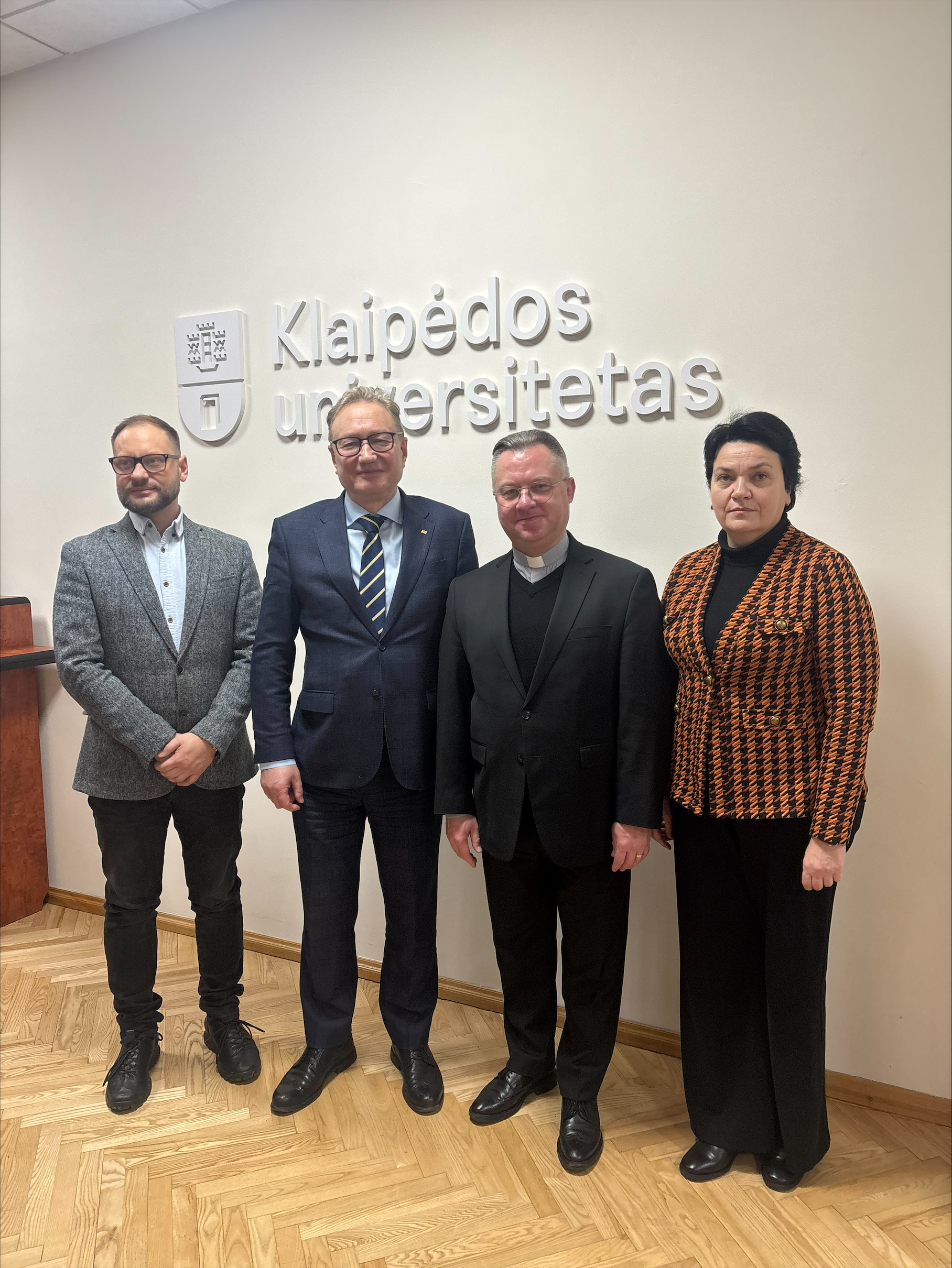 Universiteto vadovus su artėjančiomis šventėmis atvyko pasveikinti ir Klaipėdos Marijos Taikos Karalienės parapijos klebonas, kunigas Mindaugas Šlaustas. Susitikime su KU rektoriumi prof. dr. Artūru Razbadausku, studijų prorektore doc. dr. Rasa Grigoliene ir rektoriaus patarėju Modestu Vitkumi jis padėkojo universiteto bendruomenei už glaudų bendradarbiavimą bei KU studentų atsidavimą savanorystei parapijos „Carito“ veikloje. Pasak kunigo, universitetas greta mokslo visada buvo susitelkęs ir į žmogaus dvasinį ugdymą – orientuotas ne tik į žinių perdavimą, bet ir į vertybių kūrimą. Akcentuota šios krypties tęstinumo svarba.